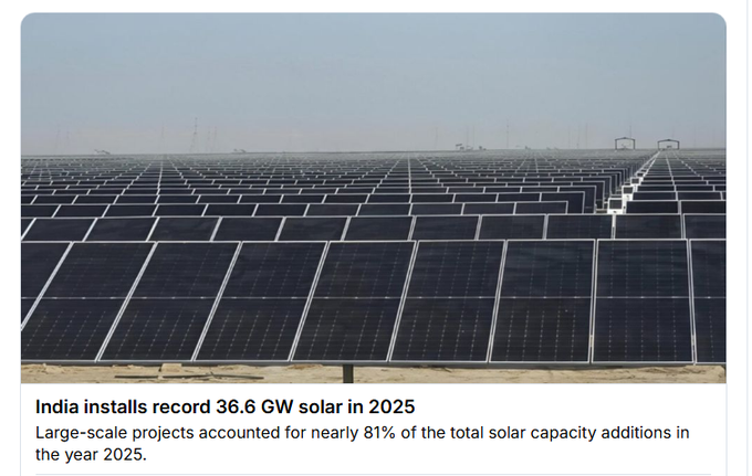 Title: Good morning with good news: India's solar installations rose 43% in 2025, compared to 2024, to 36.6 GW, up from 25 GW in 2024!2025 was the first year India passed the 30 GW level.India's solar output rose 39% in December 2025 over 12/2024!