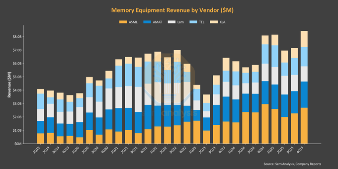 **Key Insight:** ASML is gaining share in memory, with the top-5 semicap memory revenue growing from $15.5B in '19 to $30.7B to '25.