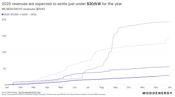 **Key Insight:** Battery revenues for ERCOT in 2025 are expected to be $29.4/kW, a 50% decrease from the previous year's levels. This is due to the lack of extreme weather events and saturation of ancillary services.
