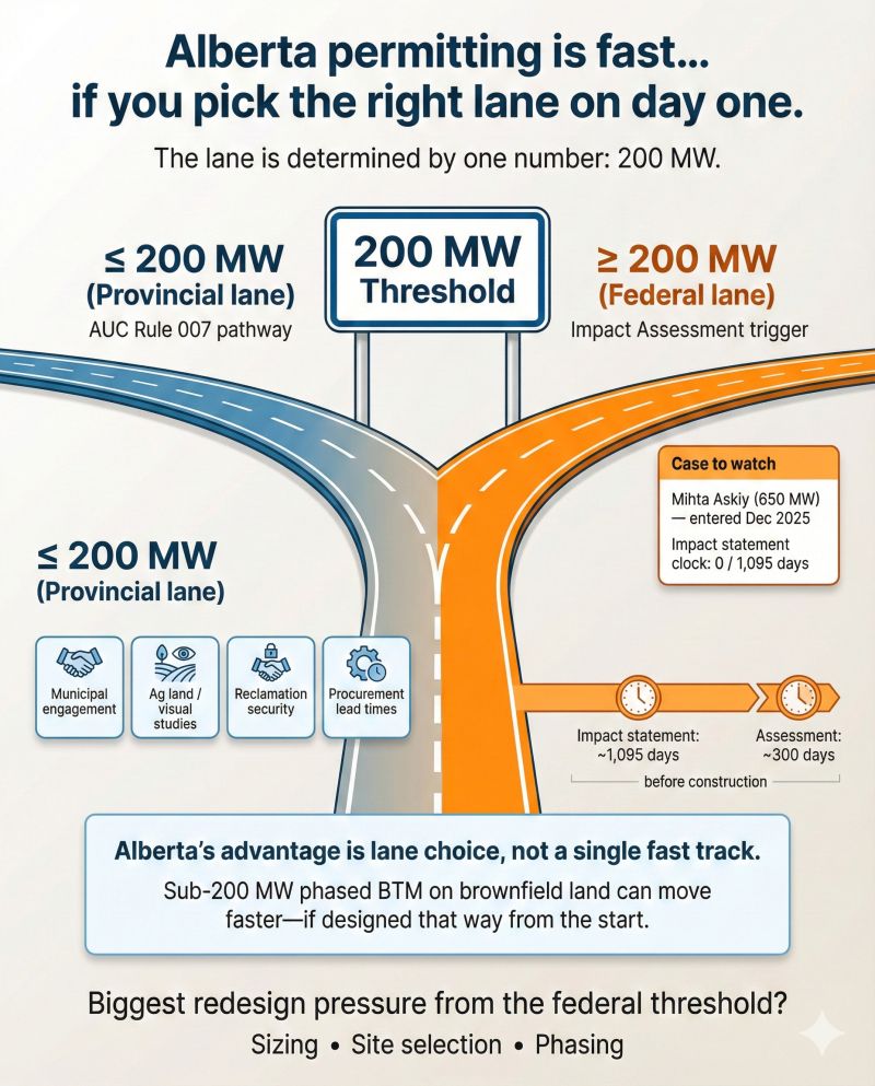 Alberta's real advantage is the choice of lanes, not a single fast track. A well-structured sub-200 MW behind-the-meter phase on previously disturbed industrial land, with gas supply secured before filing, stays entirely in provincial hands and can move materially faster. But that only works if the project is designed for it from the start - not retrofitted after the press release.