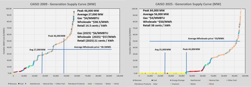 The impact of variable generation is evident, while the average wholesale price in 2009 intersected the generation supply curve between the average and peak MW load, in 2025 it intersects well above the average and peak (since at night and when the wind dies down the generation supply curve shifts dramatically). This was also seen in the ERCOT example.