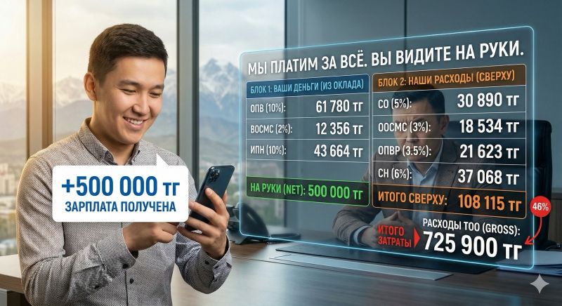 Давайте разберем на примере сотрудника, который хочет 500 000 тенге на руки (данные на 2026 год):