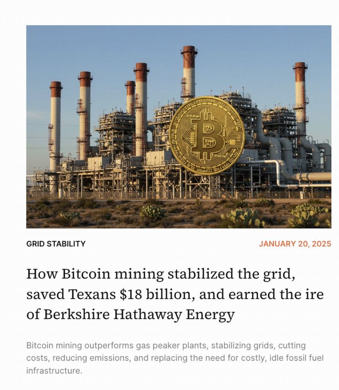 Bitcoin mining helps- decarbonize grids (through obviating the need for gas peaker plants)- stabilize grids (through being more flexible than any other energy consumer)- reduces costs to grid operators, in this case by an estimated $18 Billionhttps://lnkd.in/gyGHAEEgContext: in addition to this article, 22 peer reviewed papers and 8 independent report now point to clear environmental benefits from