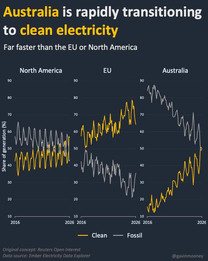 While the EU remains a global climate leader, with around 70% of its electricity now coming from clean sources, the rate of change in Australia's electricity mix over the past decade has been remarkable.