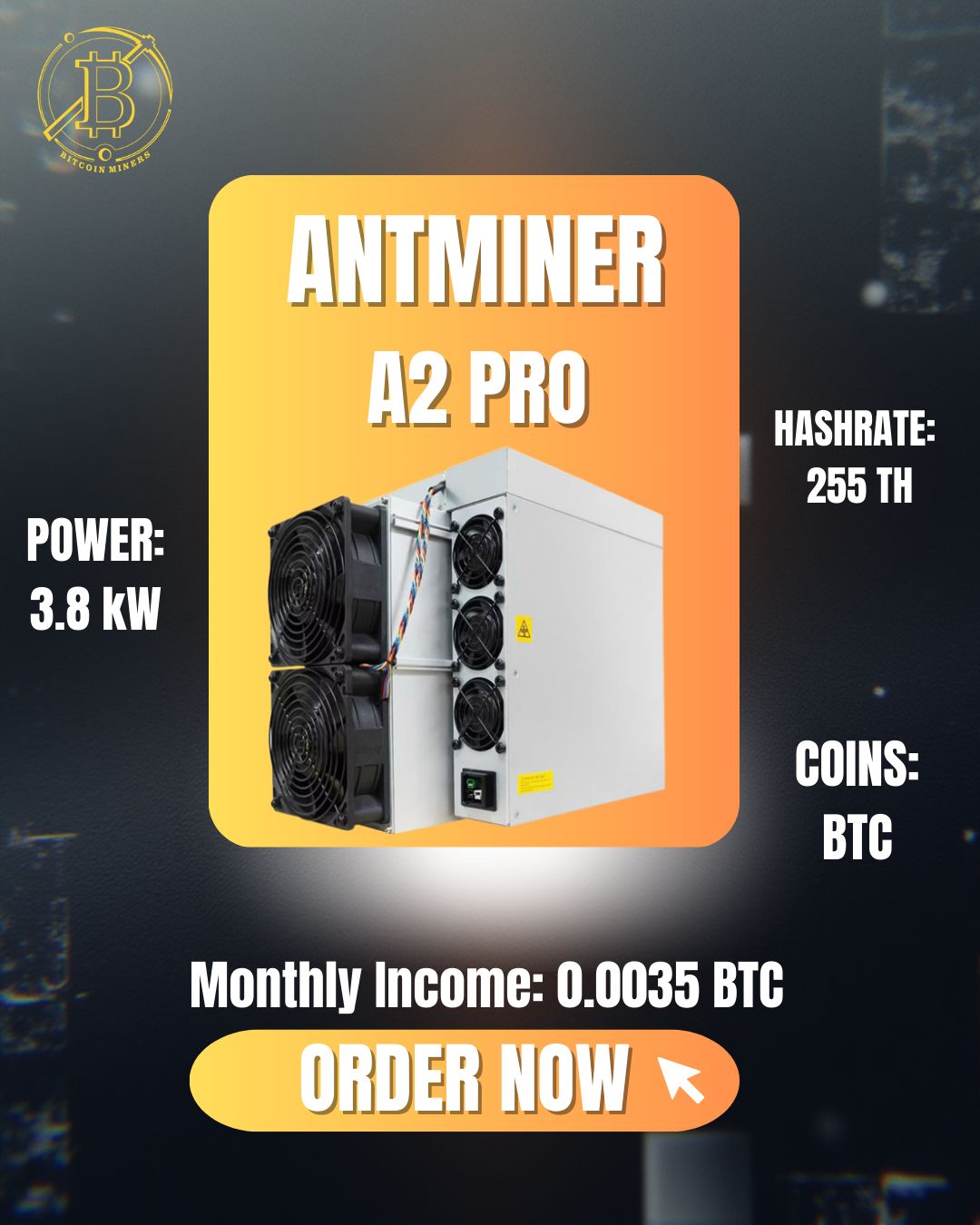 Bitcoin mining hardware. The Antminer A2 Pro is specifically mentioned as a model that can handle this demand, with a hashrate of 255 TH and an estimated production of ~0.0035