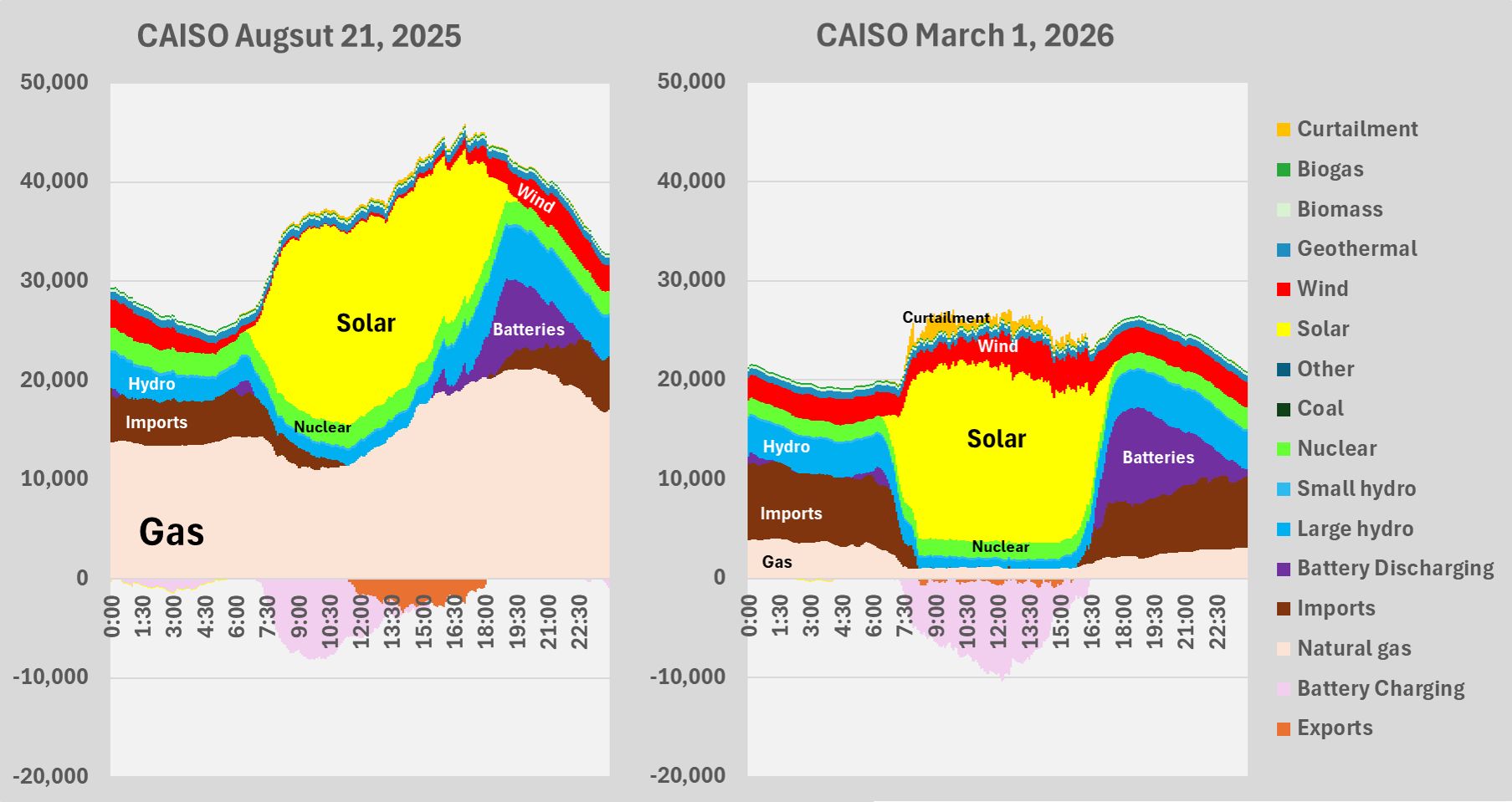 **Key Insight:** The summer demand spike in California's electricity generation is significantly higher than the March day, with peak demand reaching around 44 GW compared to ~25 GW. This surge in demand has led to a significant increase in gas-fired power plants' operation hours, which could potentially lead to increased costs and operational challenges.