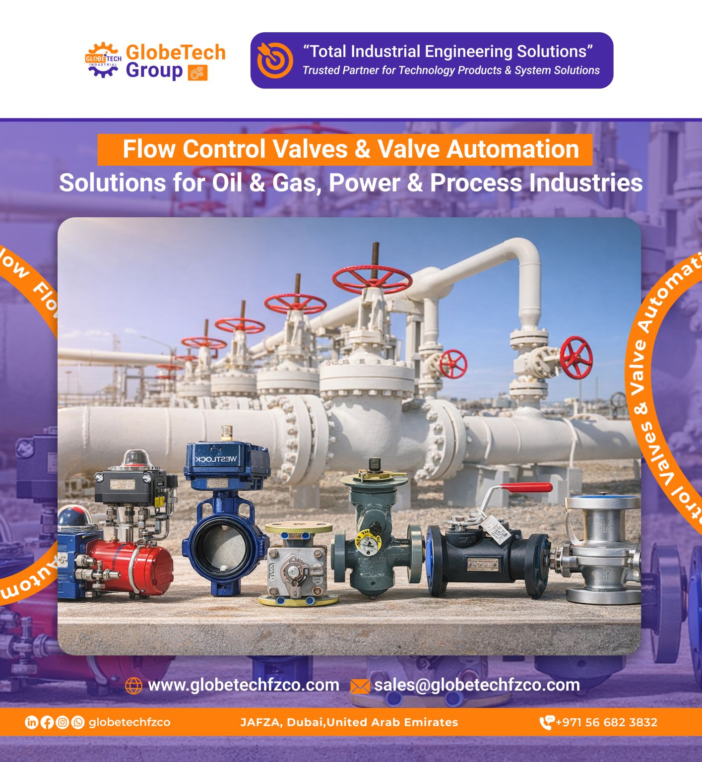 🔧 Flow Control Valves & Valve Automation Solutions for Oil & Gas, Power & Process Industries KEEPING INDUSTRY FLOWING Reliable flow control valves and automation solutions for the process industry. GlobeTech Industrial Enterprises FZCO – JAFZA, Dubai supplies a comprehensive range of industrial flow control valves and valve automation solutions supporting EPC projects, OEM skid packages, shutdown maintenance, and MRO requirements across the UAE, GCC, MENA, and international markets. With strong global sourcing and stock availability, GlobeTech delivers reliable, certified flow control solutions for demanding industrial applications. ⚙ï¸ Flow Control Product Portfolio Industrial Valves • Ball Valves (Floating & Trunnion Mounted) • Double Block & Bleed (DBB) Valves • Gate Valves • Globe Valves • Check Valves • Butterfly Valves • Plug Valves Valve Automation • Pneumatic Actuators • Electric Actuators • Hydraulic Actuators • Valve Positioners • Limit Switch Boxes • Solenoid Valves Automation Accessories • Switchboxes & Position Transmitters • Valve Monitoring Systems • Ancillary Equipment & Spare Parts 🏭 Brands Supported • WKM • KITZ • Crane • Bonney Forge • Velan • Oliver Valves UK • Apollo Valves • Neles • ASCO Solenoid Valves • Westlock Controls – Valve Monitoring Solutions • Flowserve – Keystone Valves & Actuation Systems ⚙ï¸ Engineering & Design Features ✔ Fire Safe Design ✔ Anti-static Device ✔ Blow-out Proof Stem ✔ High Pressure & Severe Service Applications ✔ Custom Engineering based on Project Datasheets Standards & Certifications • API 6D • API 607 Fire Safe Certification • ISO 9001:2015 • ISO 14001 • ISO 45001 • PED / CE Certification (TÜV) • SIL Certification • ISO 15848 Fugitive Emission 🔬 Testing Capabilities • Hydrostatic Testing • Sealing Tests • Cryogenic Testing • Anti-static Testing • NDT Inspection • Chemical & Mechanical Testing 🌍 Applications Oil & Gas Production Refineries & Petrochemical Plants Power Generation Chemical Processing Marine & Offshore Platforms Process Industry 📩 EPC Contractors, OEM Skid Builders, and Operators are welcome to send RFQs for project and MRO requirements. GlobeTech team will support with competitive techno-commercial offers and reliable delivery. 📧 RFQ: sales@globetechfzco.com 🌐 www.globetechfzco.com 🔎 Hashtags (LinkedIn Optimized) #FlowControl #IndustrialValves #ValveAutomation #OilAndGas #ProcessIndustry #EnergyIndustry #Instrumentation #EngineeringSolutions #GlobeTech #Valves #Flow #Actuators #Automation