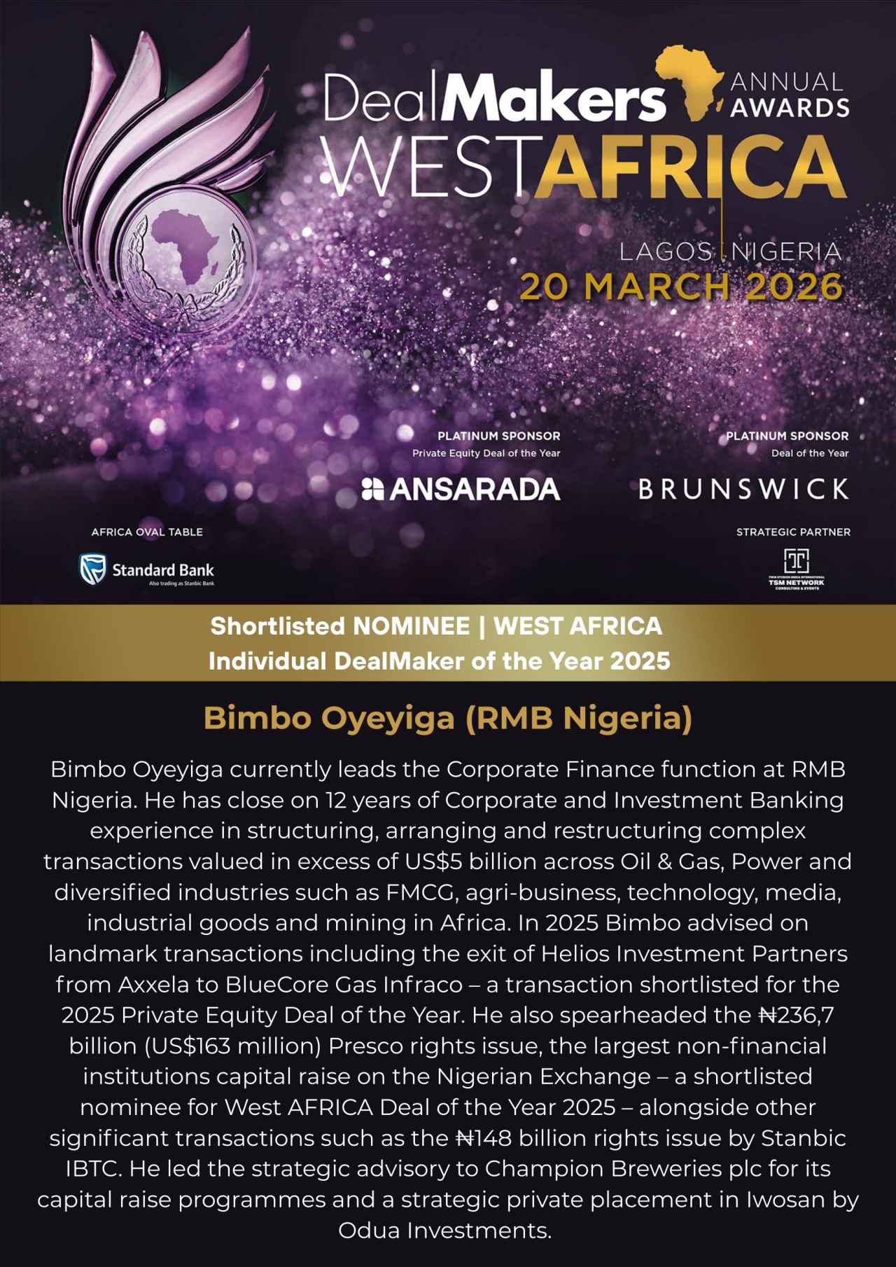 DealMakers AFRICA Awards | West Africa Shortlisted Nominees: Individual DealMaker of the Year 2025 Bimbo (Bims) Oyeyiga (RMB - Rand Merchant Bank Nigeria) Bimbo Oyeyiga currently leads the Corporate Finance function at RMB Nigeria. He has close on 12 years of Corporate and Investment Banking experience in structuring, arranging and restructuring complex transactions valued in excess of US$5 billion across Oil & Gas, Power and diversified industries such as FMCG, agri-business, technology, media, industrial goods and mining in Africa. In 2025 Bimbo advised on landmark transactions including the exit of Helios Investment Partners from Axxela to BlueCore Gas Infraco – a transaction shortlisted for the 2025 Private Equity Deal of the Year. He also spearheaded the ₦236,7 billion (US$163 million) Presco rights issue, the largest non-financial institutions capital raise on the Nigerian Exchange – a shortlisted nominee for West AFRICA Deal of the Year 2025 – alongside other significant transactions such as the ₦148 billion rights issue by Stanbic IBTC. He led the strategic advisory to Champion Breweries plc for its capital raise programmes and a strategic private placement in Iwosan by Odua Investments. Event Sponsors: Ansarada | Brunswick Group Strategic Partner: Twin Studios Media Int'l :TSM Network Consulting & Events Beverage Sponsor: CWAY WATER Africa Oval Table: Standard Bank Group