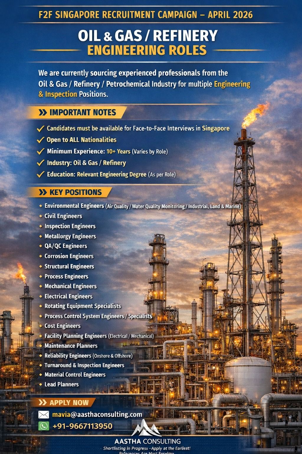F2F Singapore Recruitment Campaign (April 2026) | Oil & Gas Engineering Roles We are currently sourcing experienced professionals from the Oil & Gas / Refinery / Petrochemical industry for multiple engineering and inspection roles. Important Notes: * Candidates must be available for Face-to-Face interviews in Singapore * Open to all nationalities * Minimum experience: 10+ years (varies by role) * Industry: Oil & Gas / Refinery * Education: Relevant Engineering Degree (as per role) Key Positions: Environmental Engineers (Air Quality, Water Quality Monitoring, Industrial, Land & Marine) Civil Engineers Inspection Engineers Metallurgy Engineers QA/QC Engineers Corrosion Engineers Structural Engineers Process Engineers Mechanical Engineers Electrical Engineers Rotating Equipment Specialists Process Control System Engineers / Specialists Cost Engineers Facility Planning Engineers (Electrical / Mechanical) Maintenance Planners Reliability Engineers (Onshore & Offshore) Turnaround & Inspection Engineers Material Control Engineers Lead Planners Email ID - mavia@aasthaconsulting.com | WhatsApp: +91- 9667113950
