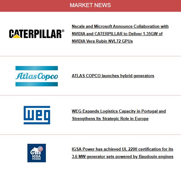 📣 Our newsletter is out! https://lnkd.in/eHHZ7A3e - Nscale and Microsoft Announce Collaboration with NVIDIA and Caterpillar Inc. to Deliver 1.35GW of NVIDIA Vera Rubin NVL72 GPUs - Atlas Copco launches hybrid generators - WEG Expands Logistics Capacity in Portugal and Strengthens Its Strategic Role in Europe - IGSA Power has achieved UL 2200 certification for its 3.6 MW generator sets powered by Baudouin engines CASE STUDIES - Caterpillar Inc. 20 X 1.1 MW FOR A MAJOR AUSTRALIAN WASTE-TO-ENERGY PROJECT - HIMOINSA: 3.6 MW OF BACKUP POWER FOR THE MOULAY EL HASSAN STADIUM - CGM gruppi elettrogeni SRL: 3 MVA FOR A NEW SHOPPING CENTER LOCATED INSIDE THE COTONOU STADIUM - ONIS VISA® Generating Sets - Visa SpA: 4 X 1,000 KVA FOR PORTUAL REFRIGERATED STORAGE - MWM Gas Engines: 2 X 2300 KW FOR AN INDUSTRIAL CUSTOMER - Jubaili Bros: HYBRID POWER SOLUTION FOR A MAJOR READY-MIX PLANT OPERATOR - HIMOINSA: 4.5 MW MEDIUM VOLTAGE (15 KV) GENERATION PLANT FOR THE INDUSTRIAL SEGMENT - Rolls-Royce Power Systems: 1,750 KVA FOR A MAJOR EQUESTRIAN AND SPORTS FACILITY