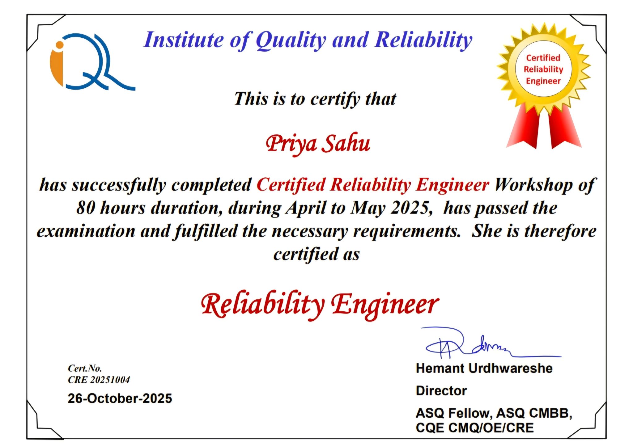🇮🇳 I’m happy to share an academic and professional update from my journey. A few months back, I cleared the CRE Examination from IQR PUNE & became a "Certified Reliability Engineer". The exam strengthened my technical foundation and gave a confidence to enhance my performance in doing reliability activities on Gas Turbine Engines. Recently, I got the opportunity to work on a research paper, where I explored practical and analytical aspects which I used to learn in my CRE classes. This experience helped me improve my understanding, research skills, and problem-solving approach. Grateful as presented my first research paper for DRDO at NPOL Kochi Kerala in hindi language. From clearing the CRE exam to contributing to research work, this journey has been full of adventure & a great exposure on 'Reliability' for 'Gas Turbine Engines'. Grateful for the support of my loving parents, my siblings, my mentors and who always encouraged me to keep going on…. Highly Obliged to my Scientists, Hemant Urdhwareshe & yashwant mahakal #Research #Defence #DRDO #Engineering #Reliability #Learning #CRE #Grateful