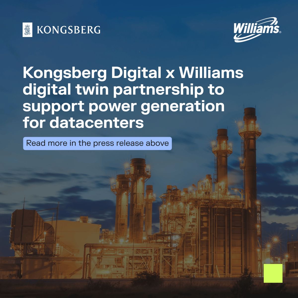 We are proud to announce that we have entered a multi-year agreement with Williams to deploy flagship Industrial Work Surface, Kognitwin®, across all Williams natural gas-fired power generation facilities. As demand for power accelerates alongside the rise of AI and hyperscale data centers, energy infrastructure is evolving from fragmented systems to integrated, real-time decision environments. Together with Williams, we’re enabling: 📊 Real-time situational awareness across assets 🔧 Predictive maintenance and performance optimization 🧠 Scenario-based decision support ⚙ï¸ Connected workflows across operations “This marks a fundamental shift in how critical energy infrastructure is operated - moving toward integrated, real-time decision environments that are reliable and optimized from the outset," said Shane McArdle, CEO of Kongsberg Digital. Read the full press release here 🔗 https://lnkd.in/esCiwYZi