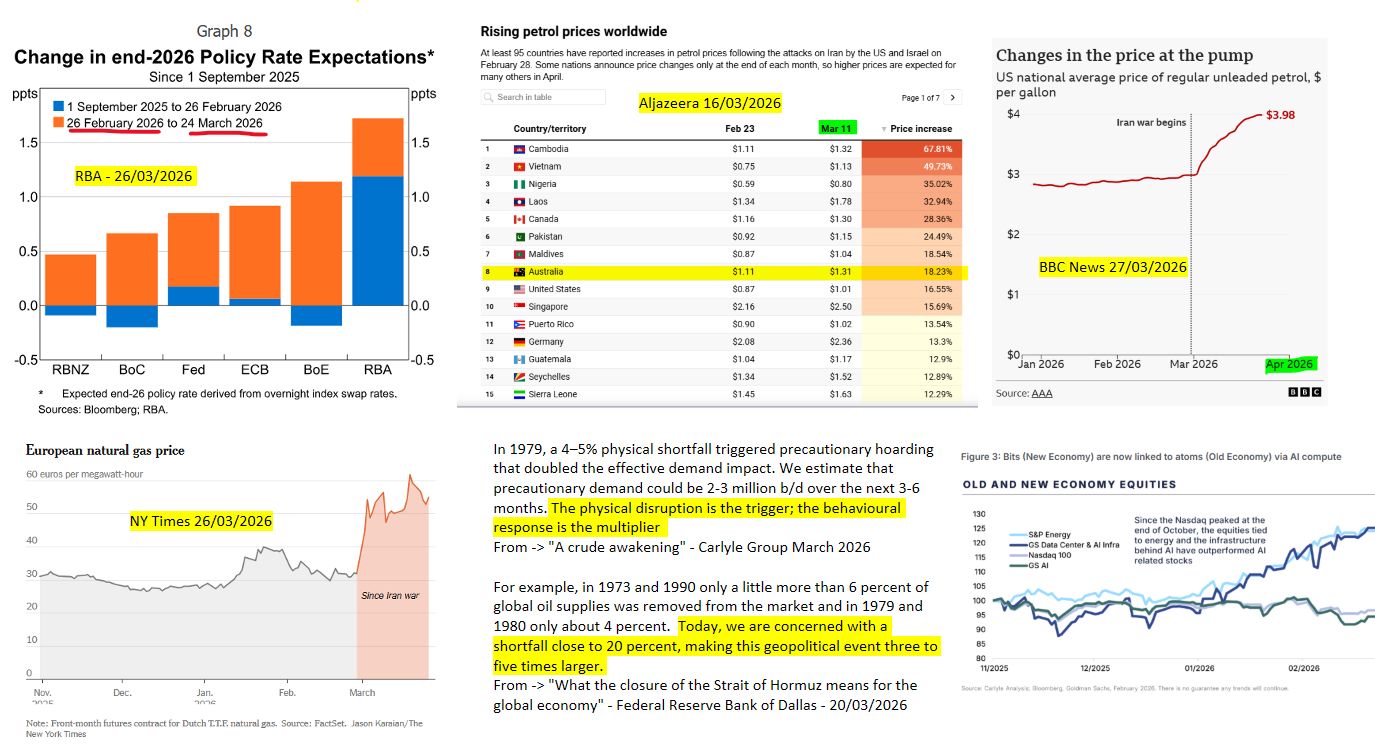Inflation expectations in Australia, globally and the closure of the Strait of Hormuz 2026 1. From an RBA article -> Reassessing Australian Financial Conditions Christopher Kent RBA Assistant Governor (Financial Markets) 26/03/2026 " Financial market participants have revised up their expectations of monetary policy rates in Australia and most advanced economies (Graph 8). The increase in Australia since the start of the conflict shown in orange has been less than some other advanced economies but it also came after an earlier increase shown in blue (reflecting relatively strong domestic data) that was not seen elsewhere , 2. From an Aljazeera article " How badly has the Iran war hit the global economy? The tell-tale signs " 16/03/2026 Note the Australia and USA are 8th and 9th respectively globally from the perspective of impacts to petrol prices following the 2026 conflict in the gulf. 3. From a BBC article 27/03/2026 "Three charts that are warning signs flashing for Trump on Iran war" Note the spike on US petrol prices per gallon, an increase from around $3 in the beginning of March 2026 to $3.98 at the end of March 2026 . 4. From the NY times 26/03/2026 "Europe Heads for Another Energy Shock in a Vulnerable State" Note the increase in Natural Gas prices in Europe from around 30 Euros per Megawatt hour in the beginning of March 2026 to around 50-60 Euros per Megawatt hour in end of March 2026 5. From a highly recommended long form article "A crude awakening" - Carlyle Group March 2026 "In 1979, a 4–5% physical shortfall triggered precautionary hoarding that doubled the effective demand impact. We estimate that precautionary demand could be 2-3 million b/d over the next 3-6 months. The physical disruption is the trigger; the behavioural response is the multiplier" "Energy has compressed to 3% of US equity market capitalisation, while technology and services have expanded to 53%. In the 1970s, energy equities at 25% of the S&P provided a natural portfolio hedge — as oil rose, energy stocks rose with it, partially insulating diversified investors. Every major geopolitical inflection point of the past fifty years — the end of the Cold War, 9/11, the global financial crisis, Ukraine — has triggered a rotation in capital allocation between asset-light and asset-heavy sectors." 6. From the Federal Reserve Bank of Dallas "What the closure of the Strait of Hormuz means for the global economy"- 20/03/2026 "For example, in 1973 and 1990 only a little more than 6 percent of global oil supplies was removed from the market and in 1979 and 1980 only about 4 percent. Today, we are concerned with a shortfall close to 20 percent, making this geopolitical event three to five times larger." 7. From the Carlyle Group "The old economy begins to take its revenge" Feb 2026 "Since October of last year, technology or new economy shares are down 5-10%, while old economy shares like energy, metals, and mining are up 30-50%. "