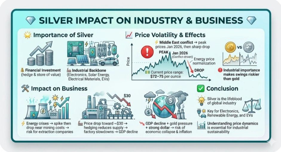 🔵 The Impact of Silver on Business Management and Industry Many believe that silver is less important than gold, with limited influence on financial markets. The reality is that silver often surpasses gold in industrial and economic significance, making it a critical indicator for business management, especially in modern industrial sectors. 💎Importance of Silver: Financial Investment – a hedge and store of value similar to gold. Industry – the backbone of modern industries: -Electronics -Solar energy -Electrical materials -Electric vehicles 💡Price Volatility and Its Effects: The ongoing conflict in the Middle East caused silver and gold prices to peak in late January 2026, followed by a sharp decline. Today, silver prices range between $72–75 per ounce. Silver price swings are more critical than gold due to their industrial importance. Impact on Business Management: 1-Energy resource crises → spike in silver prices, followed by sharp drops that may approach extraction costs, creating significant risks for mining companies. 2-Silver price drops toward ~$30 per ounce → mining companies hedge, reducing supply. This can slow or halt factories dependent on silver, leading to a decline in the GDP of industrialized nations. 3-GDP decline combined with pressures on gold and a stronger dollar → strains on gold reserves, potentially resulting in economic collapse and severe financial inflation. Conclusion: Despite its lower price compared to gold, silver is the lifeblood of global industry, from electronics and renewable energy to electric vehicles. Understanding silver price dynamics is essential for business leaders and industrial investors aiming to sustain their operations. #SilverImpact #IndustrialEconomy #BusinessManagement #RenewableEnergy #ElectronicsIndustry #InvestmentStrategy #EconomicForecast #PreciousMetals #SupplyChainRisks #PTC #EY #Amentum #GlobalIndustrialCompanies #ElectronicsManufacturing #SolarEnergyEquipment #PreventiveRiskManagement #BusinessManagementIraq #BusinessManagementSaudiArabia #BusinessManagementTurkey #BusinessManagementEgypt #BusinessManagementUAE #AmericanBusinessManagement #EUcountries #EFQM #Fortune500 #Siemens #Toyota #Nissan #Caterpillar #McKinsey #Amazon #Microsoft #BRICS #BRICSChina #BRICSIndia