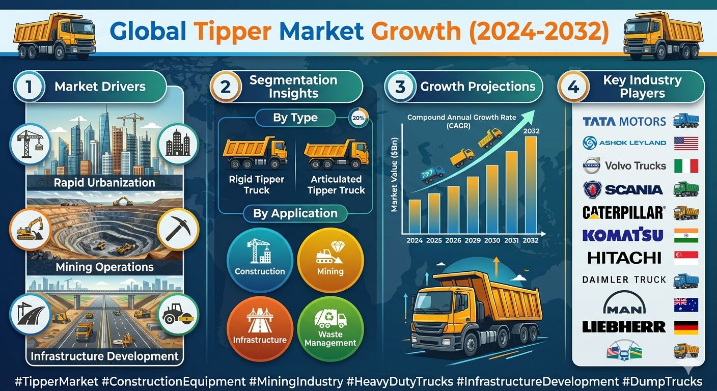 🏆 Powering Infrastructure Growth: Tipper Market Overview The Tipper Market is witnessing strong growth driven by rapid urbanization, expanding mining operations, and large-scale infrastructure development worldwide. Increasing investments in road construction, smart cities, and mining projects are accelerating the demand for high-capacity and technologically advanced tipper trucks. The market is expected to grow steadily over the coming years as construction companies, logistics providers, and mining operators adopt efficient and durable tipping solutions to improve productivity and reduce operational costs. 🚛⛏ï¸ https://lnkd.in/dgx3rZEn This report provides an in-depth environment for analyzing the Global Tipper Market. Market estimates are derived from extensive secondary research, primary interviews with industry experts, and detailed analysis of economic, technological, and industry-specific factors influencing market growth. 📊 Tipper Market Segmentation Insights 🔽 By Type : Rigid Tipper Trucks 🚛 Articulated Tipper Trucks ⚙ï¸ 🔽 By Application : Construction 🏗ï¸ Mining ⛏ï¸ Infrastructure Development 🌉 Waste Management ♻ï¸ 🏆 Key Industry Leaders Driving the Market ➡ï¸ Tata Motors Ashok Leyland Volvo Trucks Scania Group Caterpillar Inc. Komatsu Hitachi Construction Machinery Liebherr Group Daimler Truck AG MAN Truck & Bus SE SANY Group XCMG Group Zoomlion Hyundai Construction Equipment Europe Develon Group Bell Equipment Mining & Construction Terex Corporation JCB John Deere CNH Industrial America LLC Iveco Group Mack Trucks Kenworth Truck Co. Peterbilt Motors Company Freightliner Trucks ISUZU MOTORS LIMITED Hino Motors Manufacturing USA, Inc. FAW TRUCKS SINOTRUK DONGFENG TRUCKS MÉXICO Mahindra & Mahindra Limited. (Truck & Bus Division) PPS BharatBenz Eicher Trucks and Buses UD Trucks Western Star Trucks TATRA TRUCKS a.s. KAMAZ Digital Astra #TipperMarket #ConstructionEquipment #MiningIndustry #HeavyDutyTrucks #InfrastructureDevelopment #DumpTrucks #ConstructionIndustry #MiningEquipment #IndustrialVehicles #Transportation #Logistics #SmartInfrastructure #Engineering #HeavyMachinery #Manufacturing #TruckIndustry #GlobalMarket #IndustrialGrowth #FutureOfConstruction #EquipmentMarket