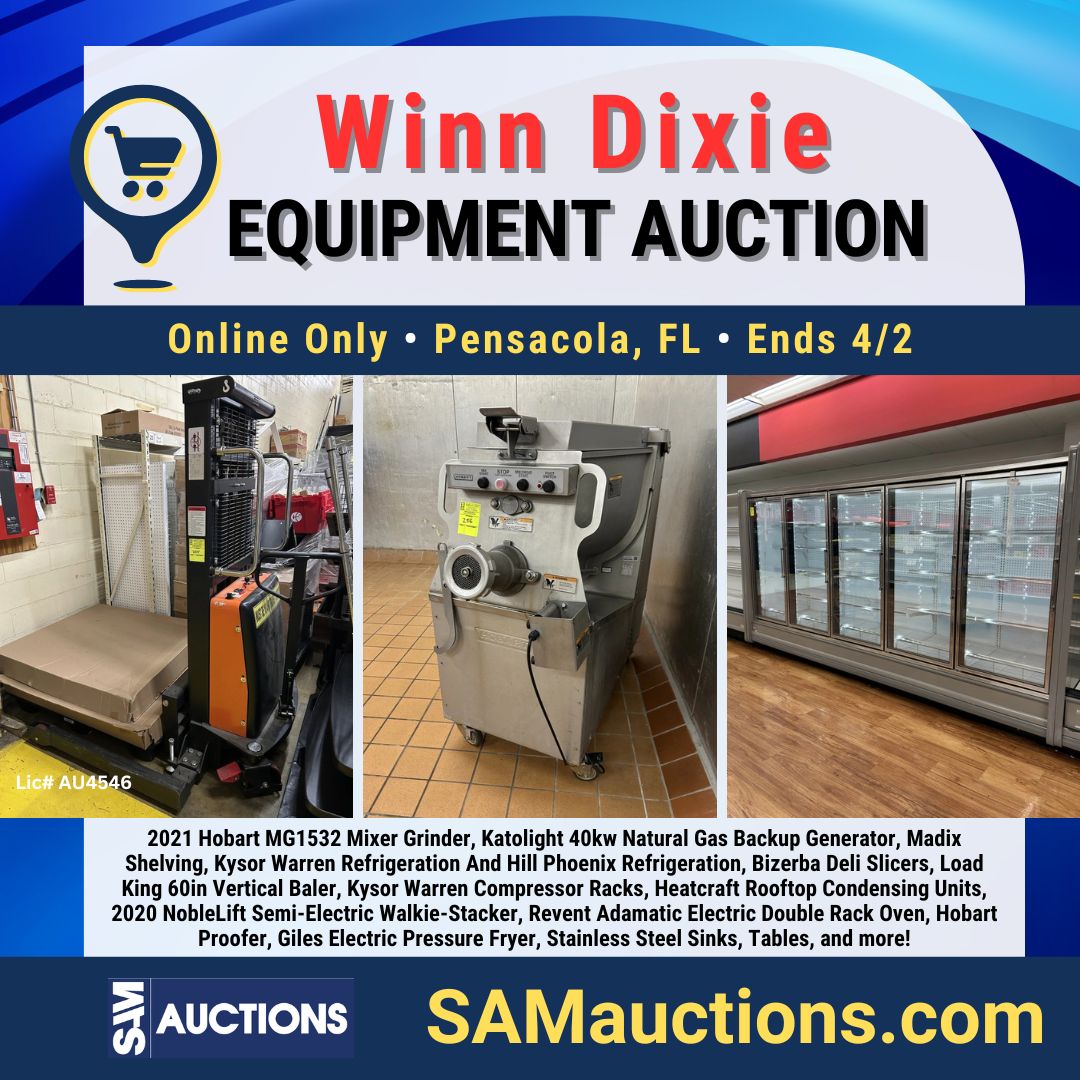 TOMORROW: Winn Dixie Equipment Auction! Featuring: 2021 Hobart MG1532 Mixer Grinder, Katolight 40kw Natural Gas Backup Generator, Madix Shelving, Kysor Warren Refrigeration And Hill Phoenix Refrigeration, Bizerba Deli Slicers, Load King 60in Vertical Baler, Kysor Warren Compressor Racks, Heatcraft Rooftop Condensing Units, 2020 NobleLift Semi-Electric Walkie-Stacker, Revent Adamatic Electric Double Rack Oven, Hobart Proofer, Giles Electric Pressure Fryer, Stainless Steel Sinks, Tables, and more! Bid Now: https://lnkd.in/geCY_8kf Lic# AU4546 #samauctions #auction #onlineauction #hobart #madix #shelving #kysorwarren #hillphoenix #revent #bakeryequipment #refrigeration #fl #pensacola