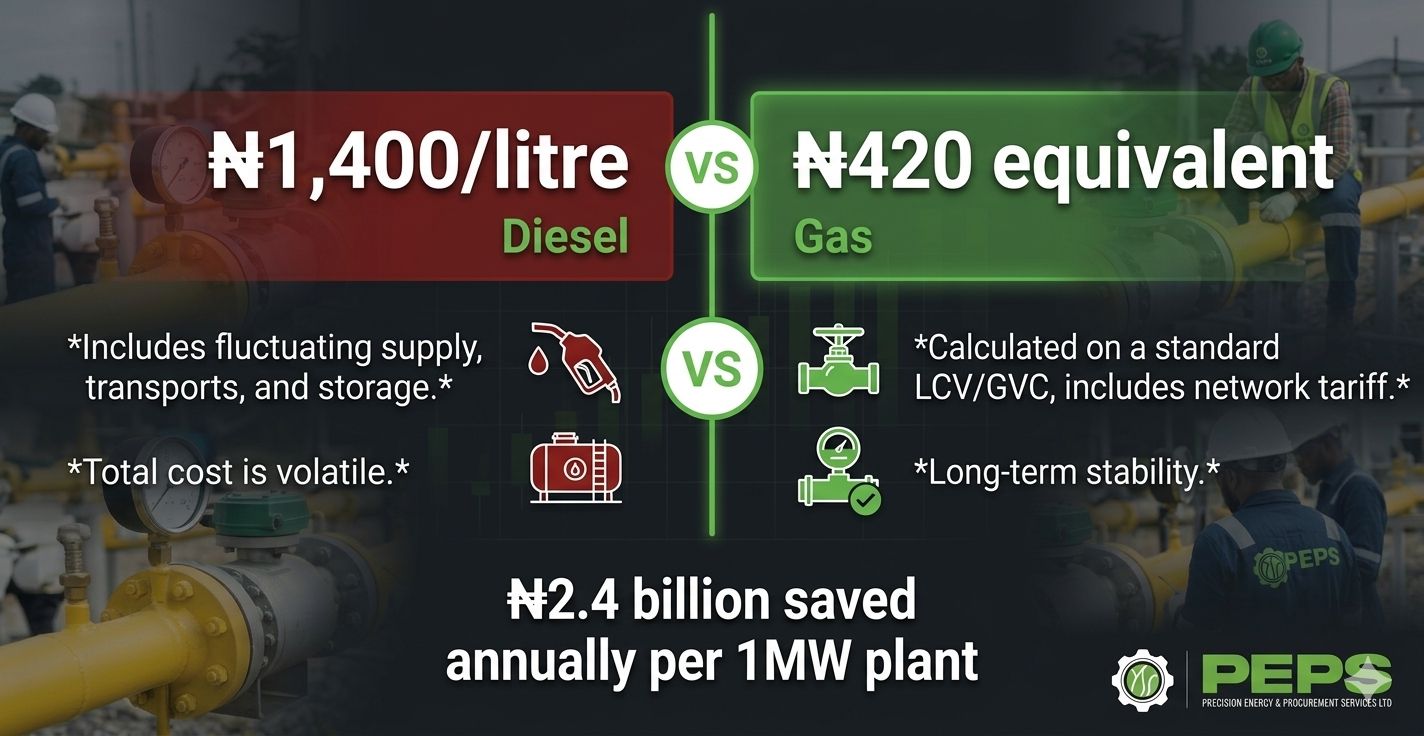 Diesel: ₦1,400 per litre. Gas: the equivalent of ₦420. For a manufacturer running a 1MW captive power system, that difference is ₦2.4 billion every year. The diesel to gas transition in Nigerian manufacturing is no longer a future trend. It is happening now and the economics are driving it faster than any government policy ever could. The numbers: Nigerian industry collectively consumes an estimated 4.2 billion litres of diesel annually for captive power generation and process heating. At current pump prices, that is approximately ₦5.9 trillion spent every year on a fuel that gas can replace at 60–75% lower cost per unit of energy. For a mid-size manufacturer running a 2MW diesel generator set plus process boilers, the annual fuel bill typically runs between ₦800 million and ₦1.5 billion. The equivalent gas bill for the same output: ₦250–480 million. What is driving the switch in 2026: The Presidential CNG Initiative has accelerated the infrastructure buildout that previously made gas adoption difficult for manufacturers not located near existing pipelines. The AKK pipeline is moving southern gas into northern industrial corridors. Gas to power connection timelines have shortened from 18–24 months to 9–12 months in many areas following PIA implementation. The sectors moving fastest: cement, food and beverage, fertiliser, and emerging adopters in textiles and plastics. What the switch requires: Every facility converting from diesel to gas needs the gas infrastructure to support it pressure reduction and metering stations, gas trains, burner management systems, CNG receiving facilities. This equipment must be correctly specified, properly installed, and commissioned to standard before the first cubic metre flows. That is the work Precision Energy does. And right now, we are busier than we have ever been. If your facility is planning a gas conversion or expanding existing gas infrastructure, talk to us. 📩 precisionenergyltd.com #DieselToGas #NigeriaEnergy #GasInfrastructure #IndustrialGas #NigeriaManufacturing #EPC #PrecisionEnergy #EngineeringNigeria #CNG #NigeriaOilAndGas #ManufacturingNG #EnergyTransition #GasConversion #EPCNigeria #PoweringNigeria