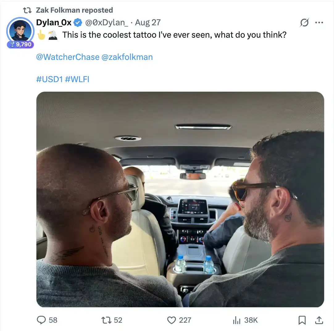 According to his own account, he was standing on the lawn with tattoos when Zach happened to drive by — "he could see I was a bit out of place, and then he said, 'Come, ride with me in a golf cart,' and that's how, on the golf cart, we started chatting randomly." This is how the Witkoff family introduced Chase Herro and his long-term business partner Zak Folkman (another WLFI co-founder who previously ran a company called "Date Hotter Girls") to the Trump family. Subsequently, the two families hit it off, joining forces to create the current WLFI project.