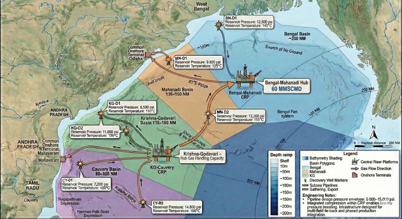 India's eastern offshore basins (KG, Cauvery, Mahanadi, Bengal) hold massive hydrocarbon potential — yet many discoveries sit stranded due to fragmented infrastructure driving up costs and breakeven thresholds.